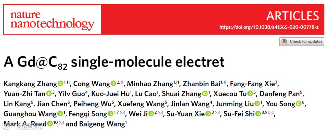 这一工作由南京大学宋凤麒、张敏昊、王伯根联合中国人民大学季威、厦门大学谢素原、伦斯勒理工学院史夙飞、耶鲁大学 Mark A. Reed 等团队一同完成。文章最近以 “A Gd @ C82 single - molecule electret” 为题于 2020 年 10 月 12 日发表在《自然·纳米技术》上 (Nature Nanotechnology, https://www.nature.com/articles/s41565-020-00778-z),文章题头如下图所示。看君有意了解其中细节,可点击文尾的“阅读原文”一览究竟。