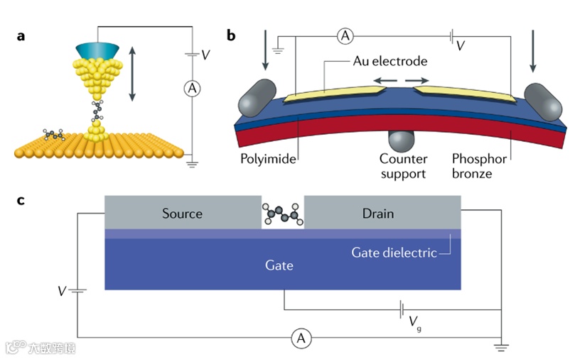 图2. 三种单分子测量技术原理示意图。(a) 基于 STM 的断裂结技术。(b) 基于机械控制的断裂结技术。(c) 基于电迁移的断裂结技术。图片来自 H. S. J. van der Zant, Nature Reviews Physics 1, 381 – 396 (2019).