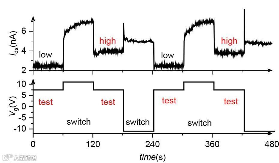 图7. 存储操作的模拟。固定源漏电压为 2 mV,栅极电压如图下半部分所示,可以看到当栅极电压改变为 switch 之后,再将栅极电压置于 test 电压时,源 - 漏电流被可控调至了低 (low) 和高 (high) 两个电流平台。