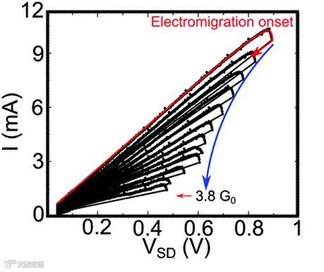 以前为了家庭用电的安全,会在进线口安装一保险丝 (现已被更安全的空气开关替代)。当总电流过大时,保险丝会熔断,阻止事故发生。电迁移类似于烧保险丝过程,只不过会通过精确控制,使断裂的间隙保持在分子尺度。形成高品质的断裂尖端,其做法不难:给光刻制备的纳米导线两端施加电压,随电压增大,电子风和发热会引起纳米线最细处原子迁移,电阻增大,电流甚至会减小,如图 4 右上角的箭头处所示。此时减小电压,避免完全断裂,再将电压重新加大。如此往复,使得电极不断迁移原子,最终断裂尖端处会演化成单个分子宽度。