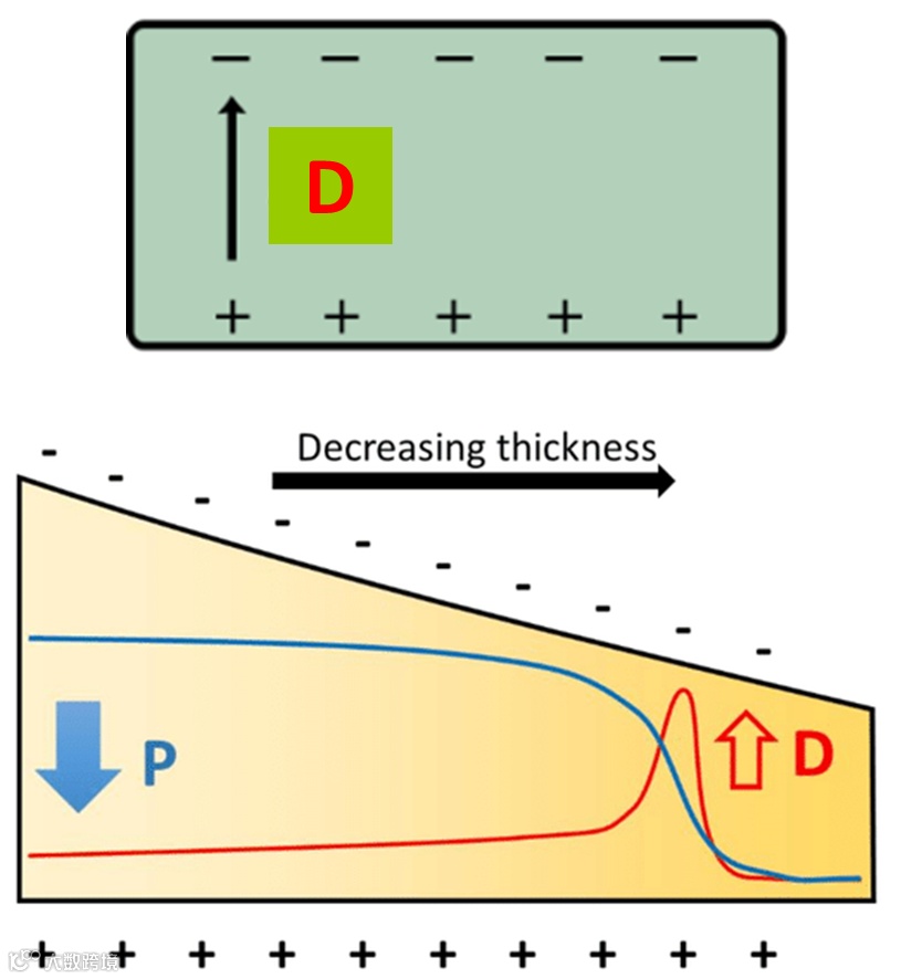 图1. 铁电性尺寸效应的示意说明图像。假定铁电极化 P 沿平板厚度方向,则上下两个表面一定存在 + / - 束缚电荷,如上图所示。束缚电荷形成内部退极化场 D,与 P 方向相反。极化 P 与退极化场 D 随厚度变化的曲线如下图中蓝线和红线所示。当厚度变得很小 (右端) 时,D 最终压制 P,此时体系内不再存在铁电极化。这就是所谓铁电极化存在极限尺寸,小于这一尺寸,铁电体便不再存在铁电极化,铁电性消失。