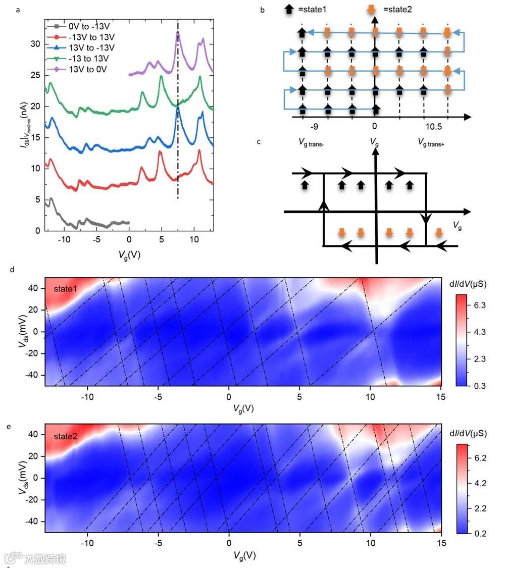 图6. 在门电压调控下单分子在两个分子态之间的转化。a 当源 - 漏电压为 2 mV 时,源 - 漏电流 Ids 随着栅极电压 Vg 的变换关系。b & c 双稳态之间的转变示意图。d &e 两种状态下的微分电导强度图。a 中横坐标为栅极电压 Vg,纵坐标为源 - 漏电流 Ids,色彩强度代表微分电导强度值。