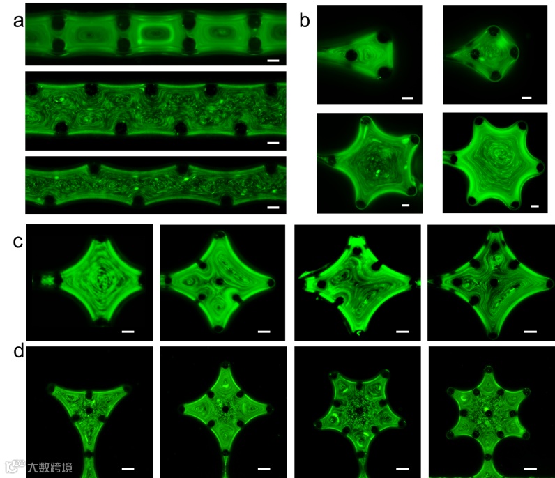 图3. 通过微结构调控流体界面构造多样的涡流形貌。