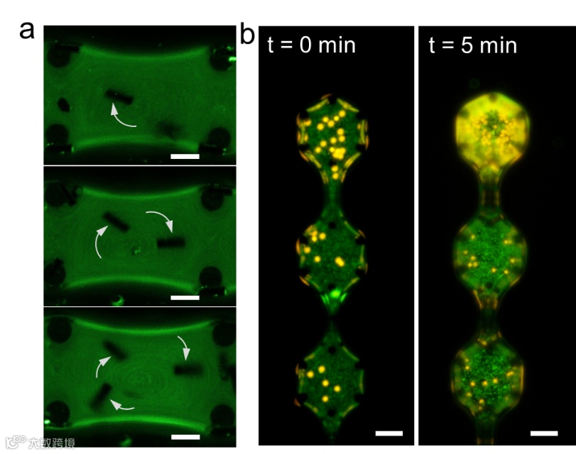 图5. 涡流实现旋转微型物体和颗粒富集。