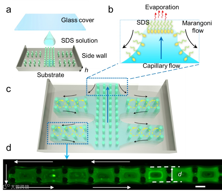 马兰格尼效应由水-空气界面的表面张力梯度引起,能够在流体表面产生切向的力。在这种表面力作用下,在蠕动流状态下流体也可以产生旋涡流。该工作通过蒸发诱导马兰格尼流的形成,进而形成一个自驱动的涡流体系。其中通过结构设计而产生一个不均匀的蒸发场,在液体表面形成不均匀的表面活性剂浓度分布,进而形成马兰格尼流(如图2所示)。