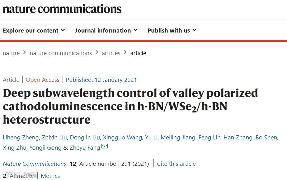 北京大学物理学院方哲宇教授团队,近期报道了一种利用超高分辨电子束操控金属等离激元调控低维量子材料谷极化的新方法。研究人员首先设计了结构对称的纳米天线与六方氮化硼/二硒化钨/六方氮化硼的金属/介质复合纳米结构,利用入射电子束超高分辨的特点,精准激发了金属纳米天线的圆偏振偶极电磁模式,通过近场相互作用在纳米尺度实现了对低维材料谷极化的操控。利用电子束激发位点的移动(空间分辨率小于5纳米),能够在50纳米内实现谷极化的“开”和“关”,以及100纳米内的谷极化态反转。相关工作以《Deep subwavelength control of valley polarized cathodoluminescence in h-BN/WSe2/h-BN heterostructure》为题发表在Nature Communications,12:291(2021)上。