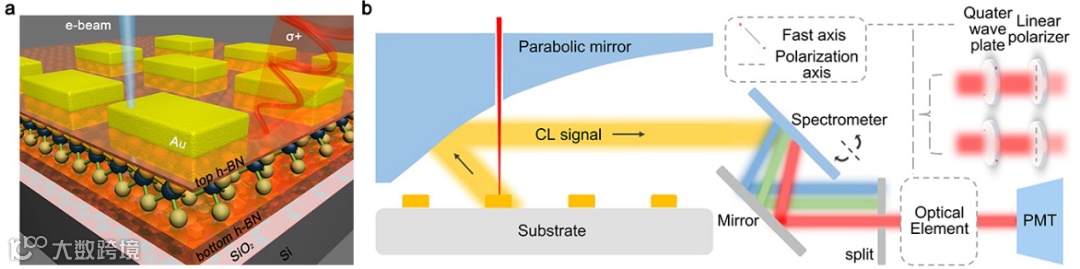 鉴于此,研究者提出一种基于纳米天线的新型二硒化钨谷极化电子束操控方法(图1a)。通过在六方氮化硼/二硒化钨/六方氮化硼异质结上设计一些非手性的长方形纳米天线,利用电子束局域激发打破对称性,获得纳米天线圆偏振偶极电磁模式。移动电子束激发位置可改变局域光子态密度分布,操控结构电磁场模式,并通过自主改造的收集光路(图1b)对纳米结构不同偏振态的远场辐射进行表征。