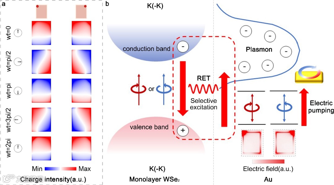 进一步,研究者从原理上对近场谷极化操控进行了分析,从电磁场模拟的金属纳米天线电荷分布随时间演化图可以看出,激发位置不同可以产生不同旋性的圆偏振偶极电磁模式(图3a),与上述谷极化光谱的响应一一对应,因此可以认为纳米天线与单层二硒化钨之间发生了以偶极-偶极相互作用的共振能量转移,在近场范围内满足了谷极化激发的条件(图3b)。