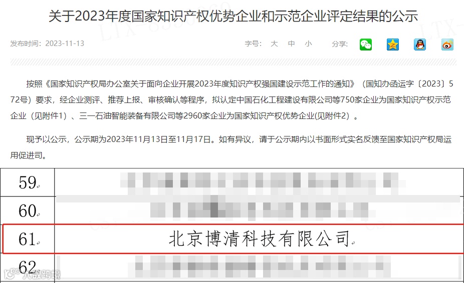 11月,国家知识产权局运用促进司按照《国家知识产权局办公室关于面向企业开展2023年度知识产权强国建设示范工作的通知》要求,经企业测评、推荐上报、审核确认等程序,认定北京博清科技有限公司为国家知识产权优势企业,博清科技在知识产权领域再下一城。