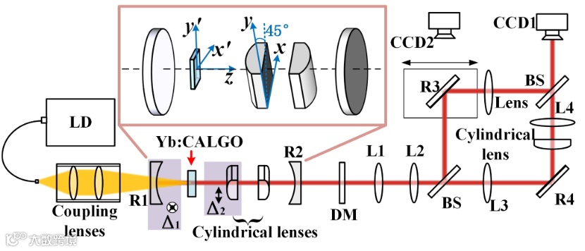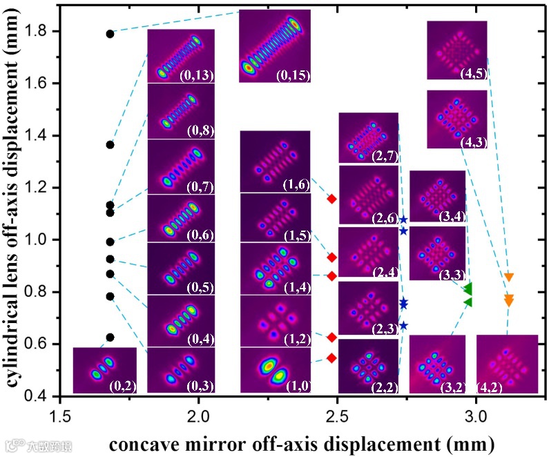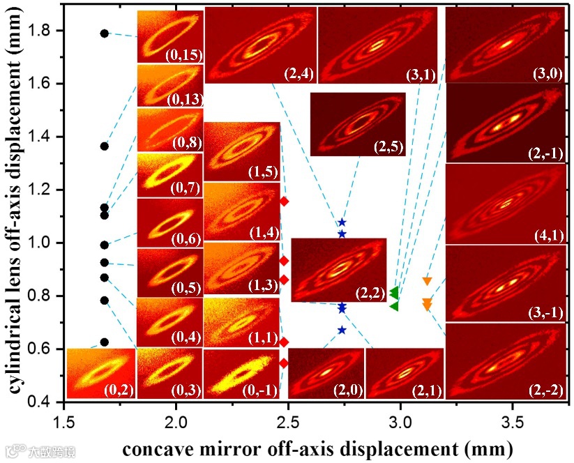 因此,为了打破参数控制的限制,我们在腔内引入了一对柱透镜,通过控制腔镜和柱透镜的各自离轴,实现模式两个参数维度的分别自由控制,突破了腔内产生结构光控制自由度小的限制,且通过对腔内元件沿传输方向参数控制,还可直接输出携带轨道角动量的光束,为实际应用提供更简单,更紧凑,模式更加丰富可控的装置。