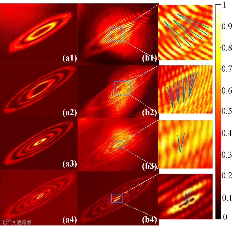 此外,通过腔内柱透镜间距离的参数调节,我们的结构光激光器还可实现携带轨道角动量光束的直接输出,如图5所示。此结果解释了腔内模式转换的实质,同时为实际应用提供了一个可实现多功能的结构光激光器。