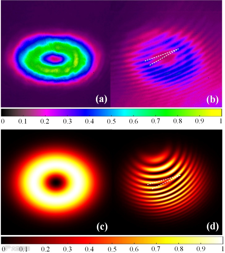 图5 (a)±1ħOAM模式实验光场分布图和(b)干涉光场分布图,(c)仿真光场分布图和(d)干涉光场分布图。