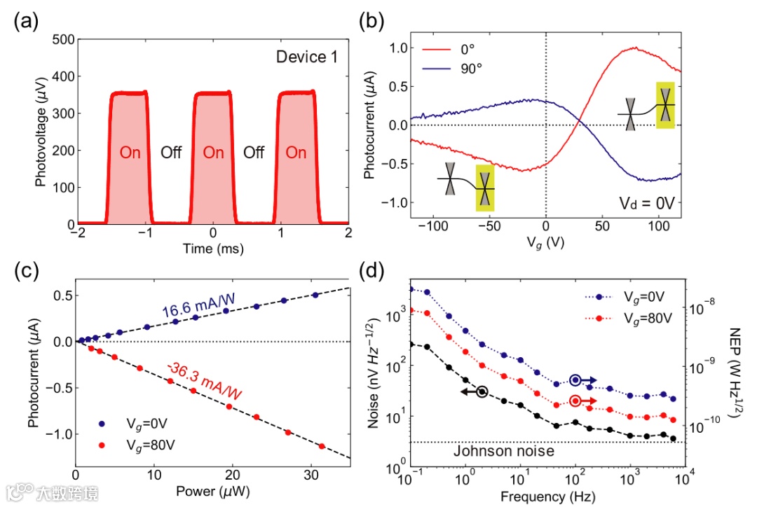 此外,该器件也具有一般石墨烯探测器通有的优点,诸如门电压可调,响应速度快,以及在无偏压时的低噪声等(图2)。在4微米波长,研究人员测到的响应强度达到36.3 mA/W,由此得到的噪声等效功率(NEP)达到0.12 nW/Hz-1/2。