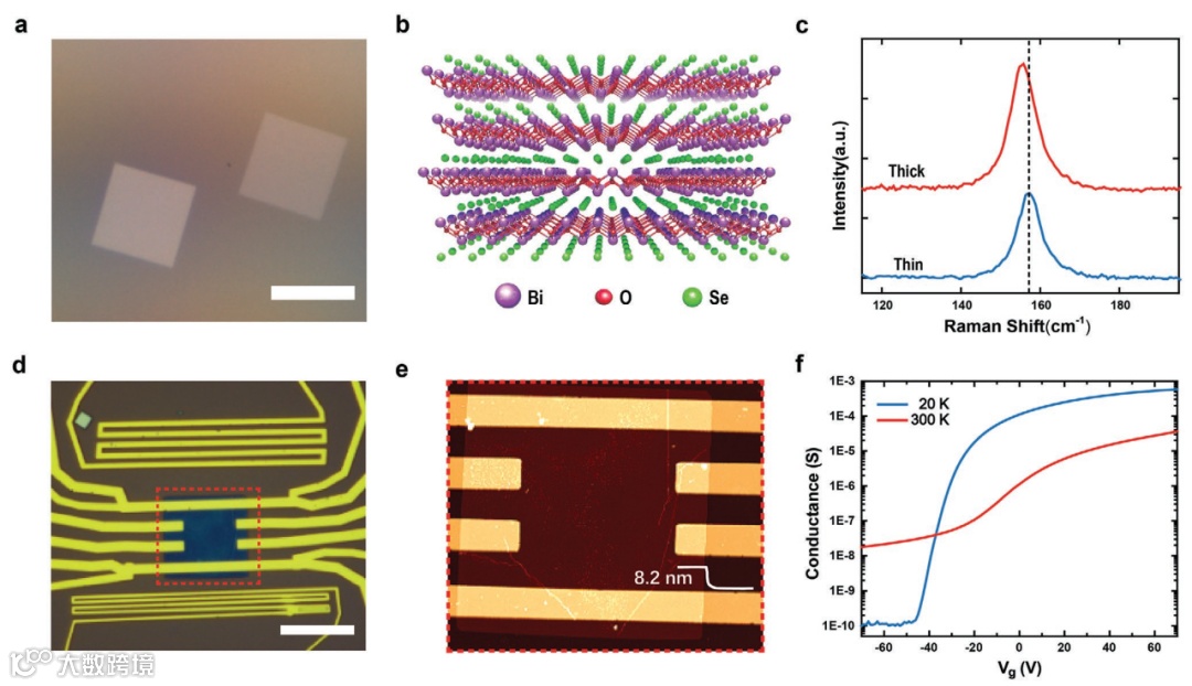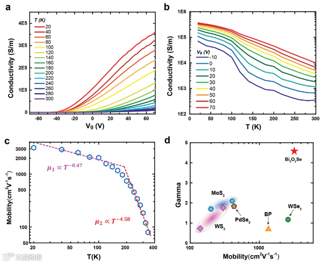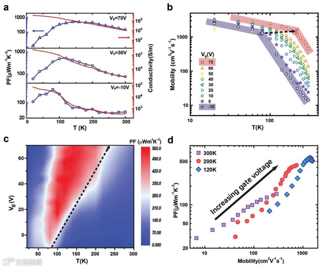 不同于目前广泛研究的石墨烯,过渡金属硫化物,黑磷等二维材料,二维Bi2O2Se的低声子群速度和强声子非谐散射使其具有极低的热导率(~0.92 W/mK APL 115, 193103 (2019)),同时兼具的高电子迁移率和良好的环境稳定性使得其在热电以及能源转化领域有着巨大的潜力。研究人员发现二维Bi2O2Se载流子迁移率在高温下由极化光学声子散射主导,在低温下由压电散射主导(如图3c所示)。当压电散射主导时,其迁移率显著提高。同时电导率的急剧上升并没有导致塞贝克系数的明显下降,表明散射机制的调控可以实现电导率和塞贝克系数的去耦合(如图2d所示)。这与之前通过调控载流子浓度来平衡电导率和塞贝克系数的策略显著不同。同时,研究人员还发现这种散射机制的转变温度具有高度的门电压可调性,通过施加一定大小的门电压,可以显著提高极化光学声子散射到压电散射的转变温度,最终实现宽温度范围(80-200K)的高热电功率因子{>400μW/(m·K2)}。