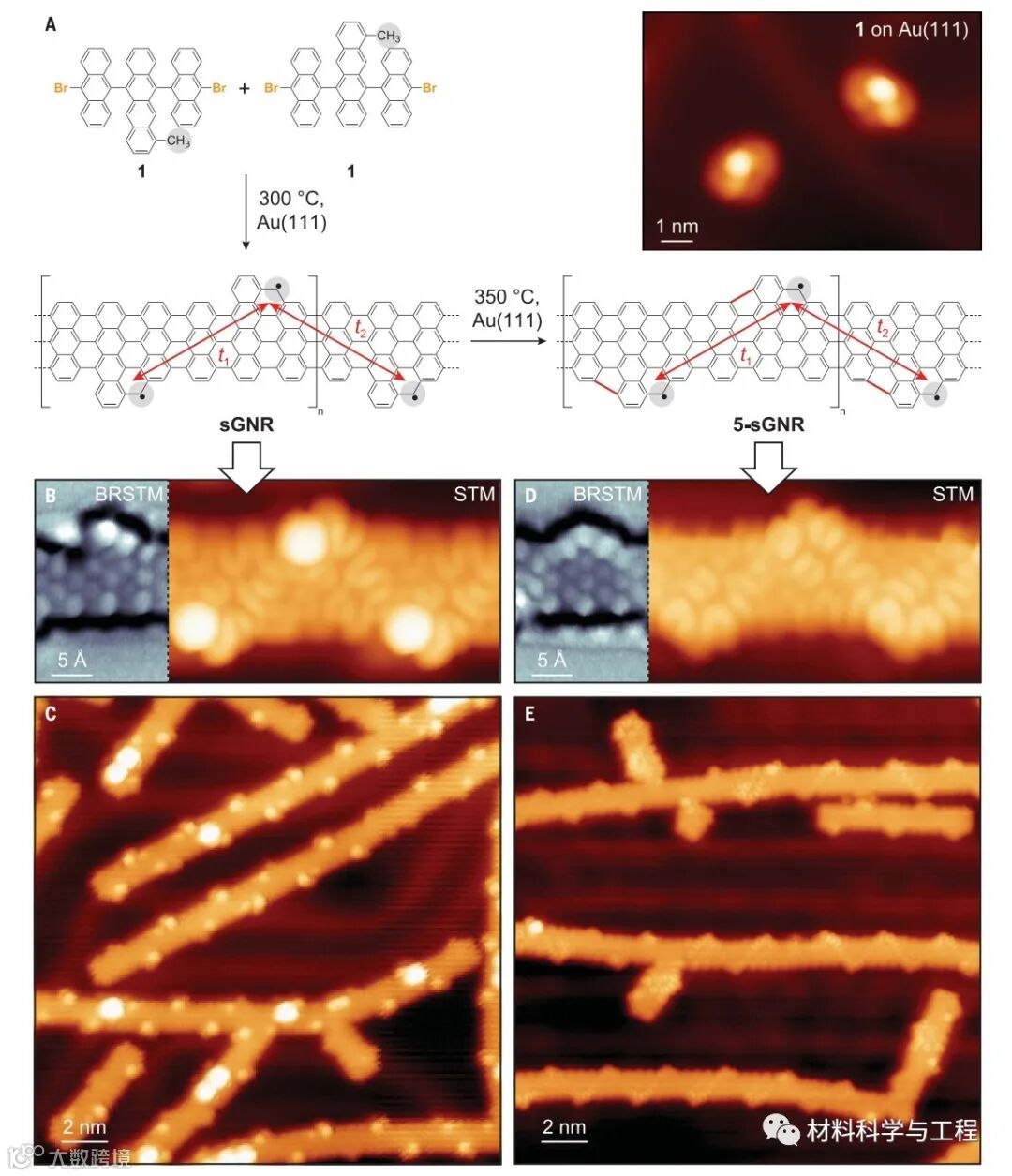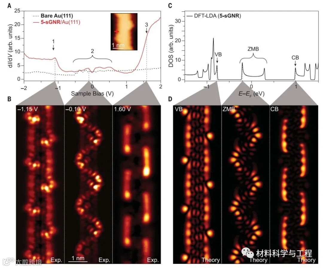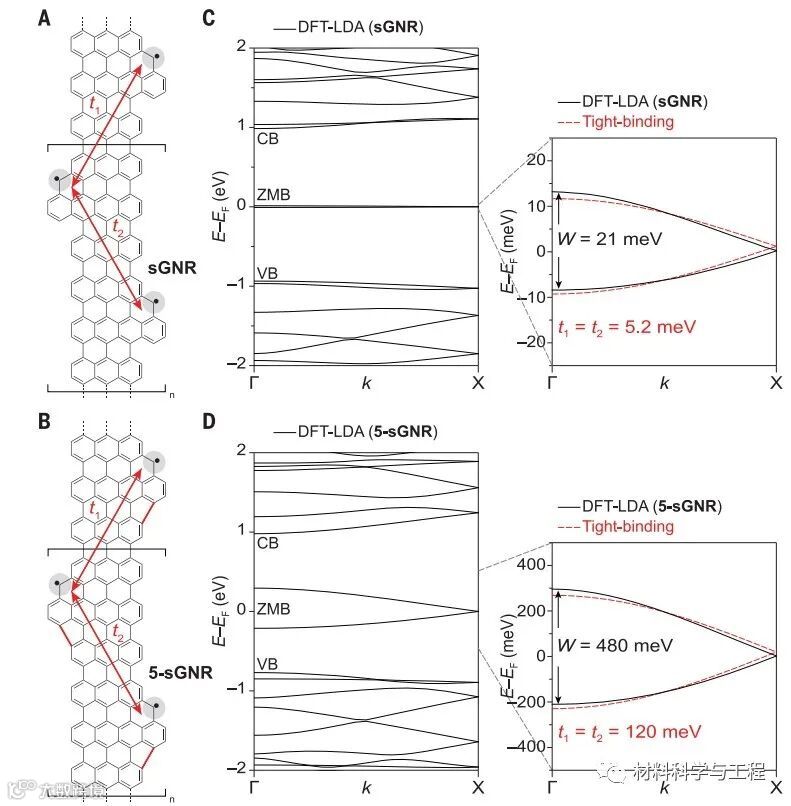 石墨烯我们都很熟悉,那石墨烯纳米带(GNRs)呢?按定义,石墨烯纳米带是指大概宽度小于50 nm的石墨烯条带。其理论模型最初于1996年提出。为了要赋予单层石墨烯某种电性,会按照特定样式切割石墨烯,形成石墨烯纳米带(Graphene nanoribbon)。切开的边缘形状可以分为锯齿形和扶手椅形。采用紧束缚近似模型做出的计算,预测锯齿形具有金属键性质,又预测扶手椅形具有金属键性质或半导体性质;到底是哪种性质,要依宽度而定。可是,近来根据密度泛函理论计算得到的结果,显示出扶手椅形具有半导体性质,其能隙与纳米带带宽成反比。实验结果确实地展示出,随着纳米带带宽减小,能隙会增大。但是,直至2009年, 尚没有任何测量能隙的实验试着辨识精确边缘结构。通过施加外磁场,石墨烯奈米带的光学响应也可以调整至太赫兹频域。