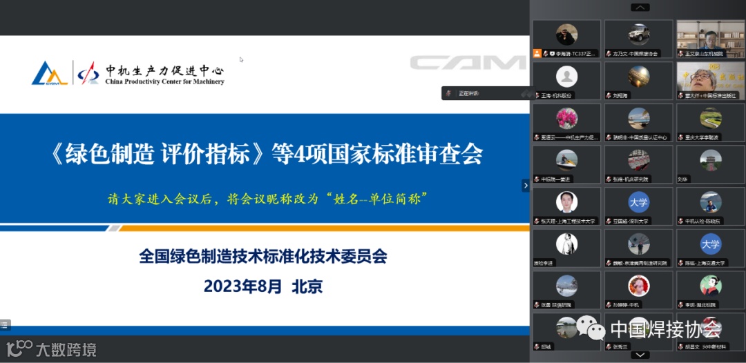 《焊接加工能耗检测方法》(20213388-T-469)国家标准评审会在线上成功召开。全国绿色制造标准化技术委员会共计52位委员参加了评审会议。