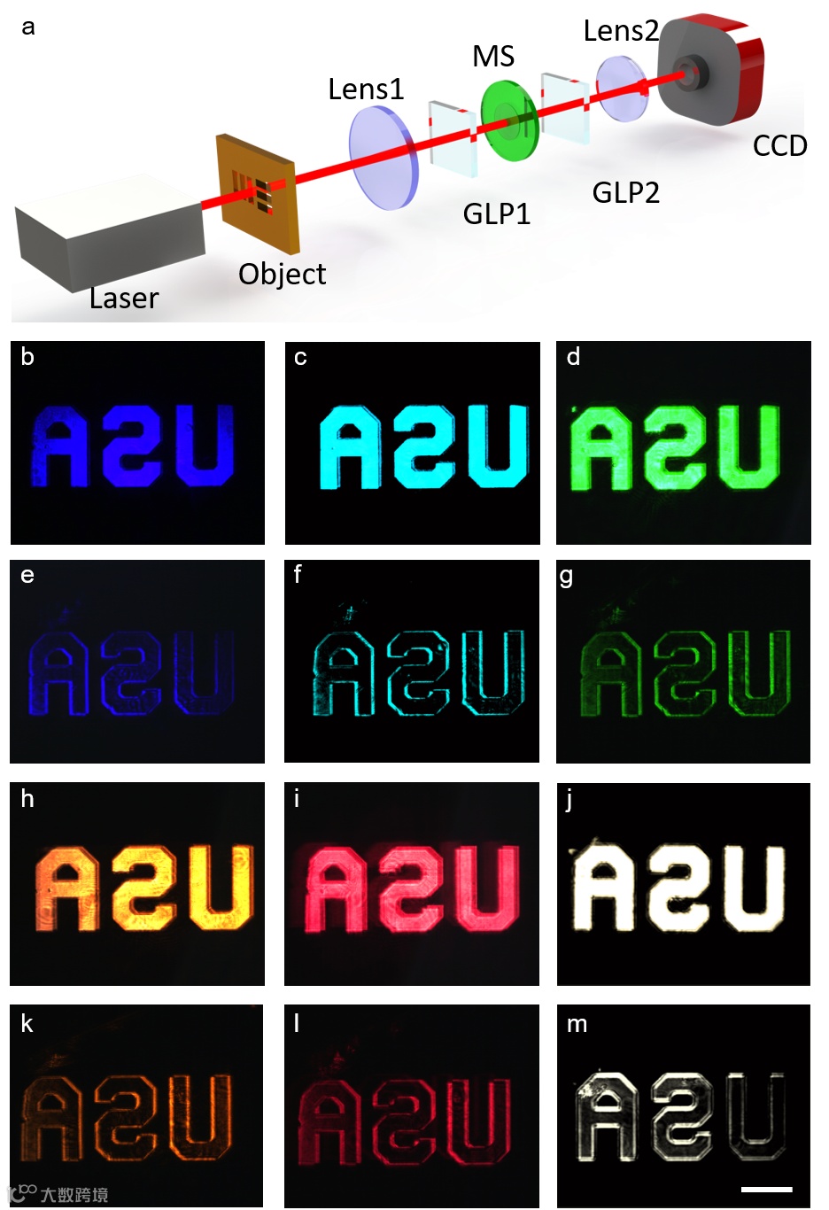 图1. 振幅型物体的二维边缘检测. a, 实验装置. b-d和h-j, 通过去除第二偏振器的结果。e-g和k-m, 分别在410 nm,490 nm,540 nm,590 nm,690 nm和白光下的边缘图像。标尺,1毫米