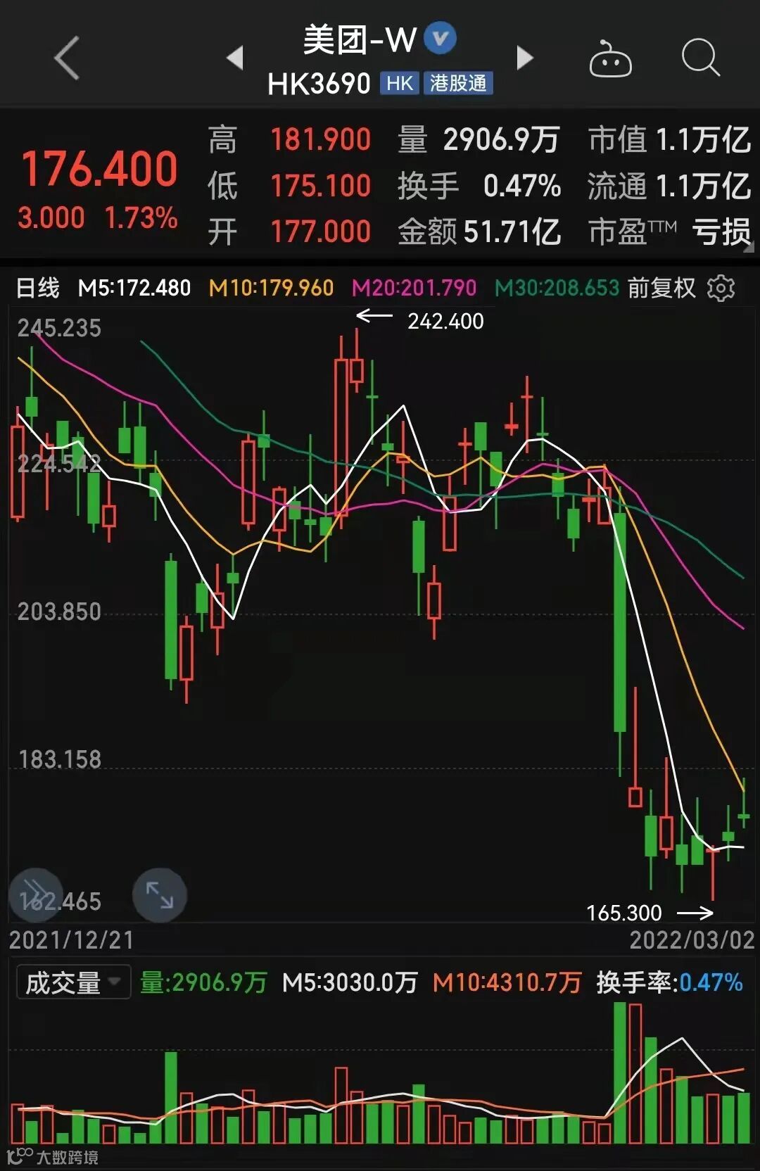 3月2日,美团盘初一度拉升涨近5%,收盘涨1.73%。