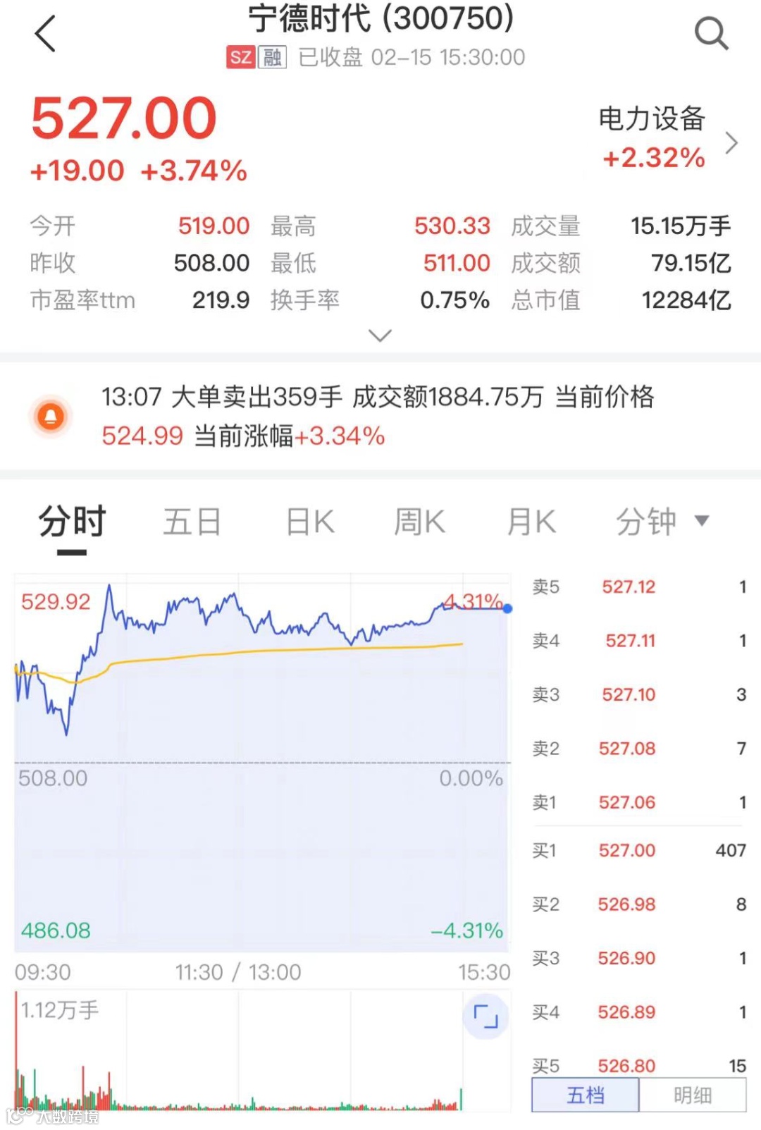 宁德时代股价一改虎年开年颓势,2月14日收涨3.68%,股价回到508元/股。2月15日股价上涨3.74%,报527元/股。