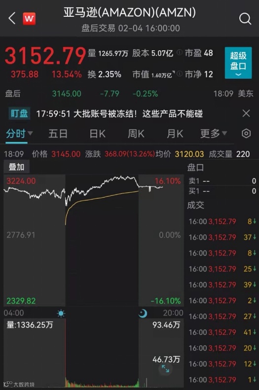 当地时间2月4日,美股三大指数收盘涨跌不一。亚马逊收涨13.54%,创2015年以来最大单日涨幅,市值增加1910亿美元(约合1.2万亿元人民币),创美股市场单日个股市值最大涨幅纪录。