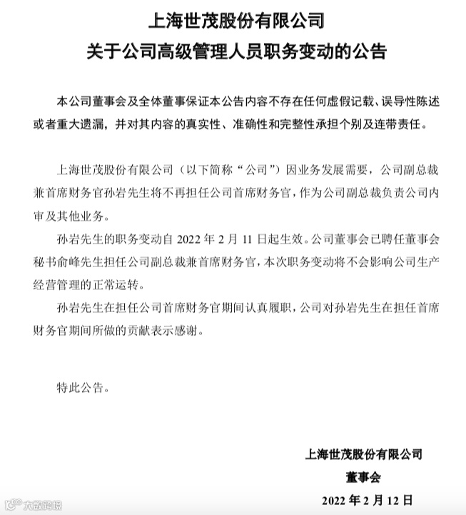 此外,世茂股份公告称,经董事会批准,世茂股份聘任俞峰担任公司副总裁兼首席财务官、董事会秘书的职务。因业务发展需要,原公司副总裁兼首席财务官孙岩将不再担任首席财务官,作为公司副总裁负责公司内审及其他业务。