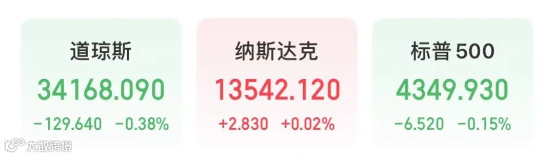 美股三大指数冲高回落,收盘涨跌不一。道指跌0.38%,盘中一度涨约1.5%;标普500指数跌0.15%,盘中一度涨超2.2%;纳指涨0.02%,盘中一度涨约3.4%。