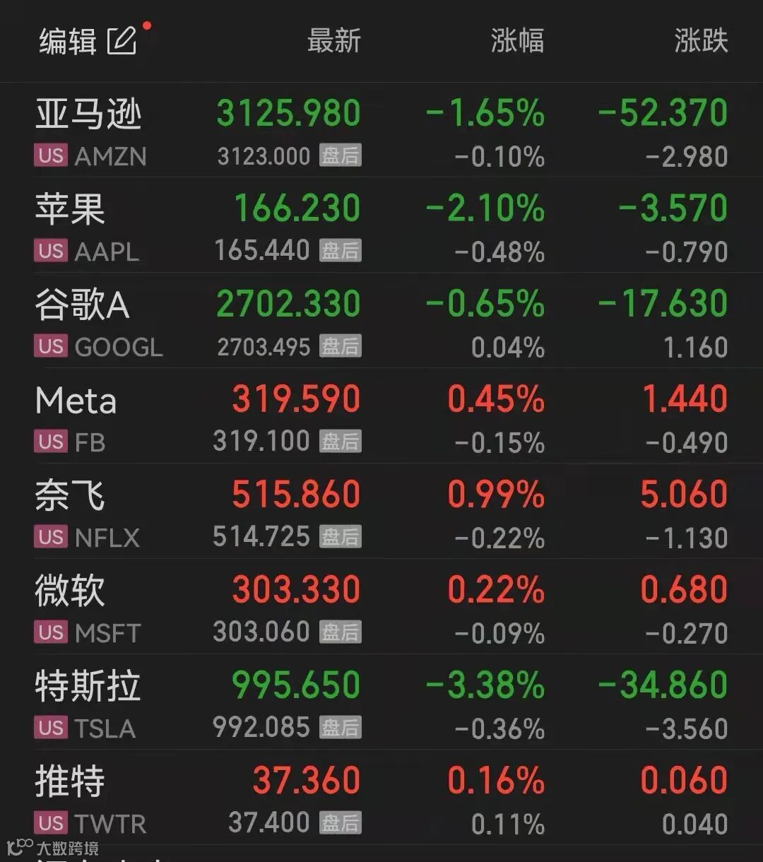 美大型科技股周三涨跌互现,特斯拉下跌3.38%。