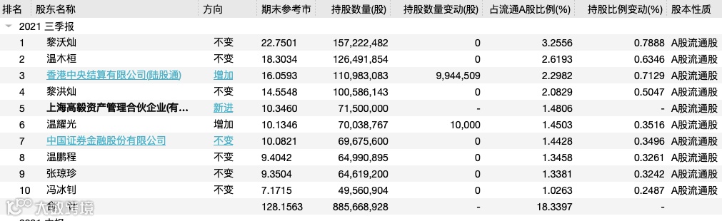 截至2021年三季度末,温氏股份十大流通股东中,高毅邻山1号远望基金新进为第五大流通股东,持股7150万股,占流通股比1.48%,香港中央结算有限公司增持994.45万股。