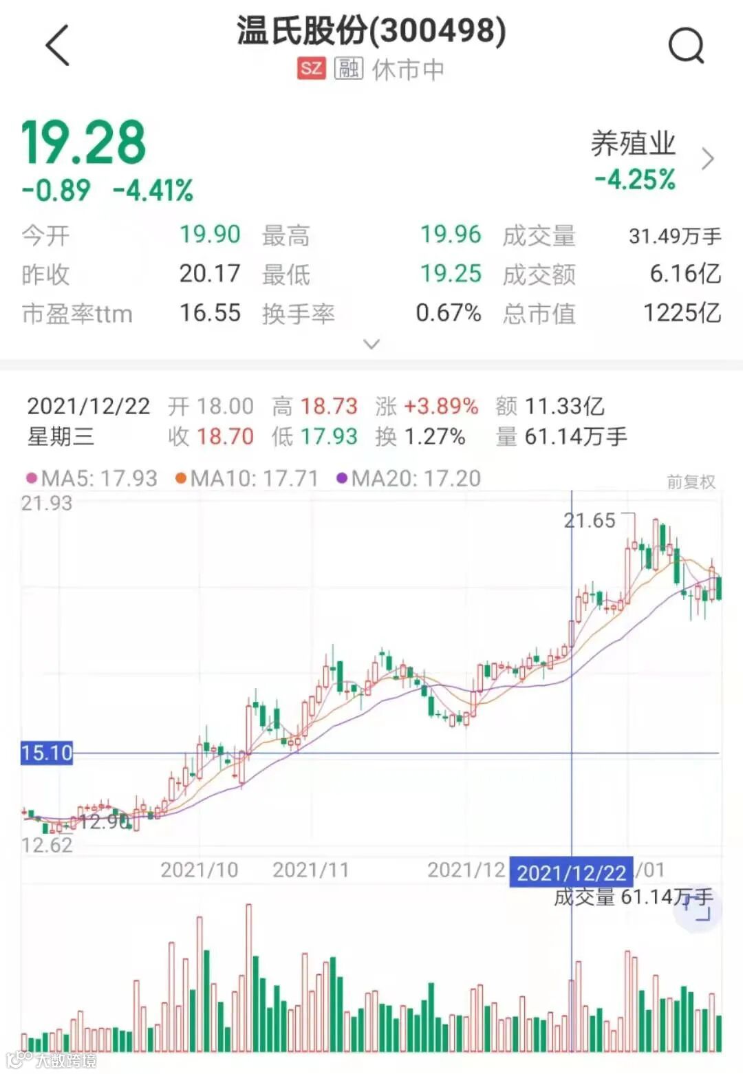 温氏股份股价近半年止跌反弹,由每股12.14元最高涨至每股21.65元,区间涨幅达74.55%。近期有所回落,截至1月21日收盘,每股报收19.28元,总市值1225亿元。