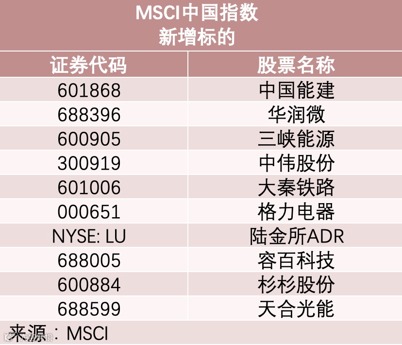 具体来看,MSCI中国指数本次新增10只标的,其中包括9只A股标的。分别是中国能建、华润微、三峡能源、中伟股份、大秦铁路、格力电器、陆金所ADR、容百科技、杉杉股份、天合光能。