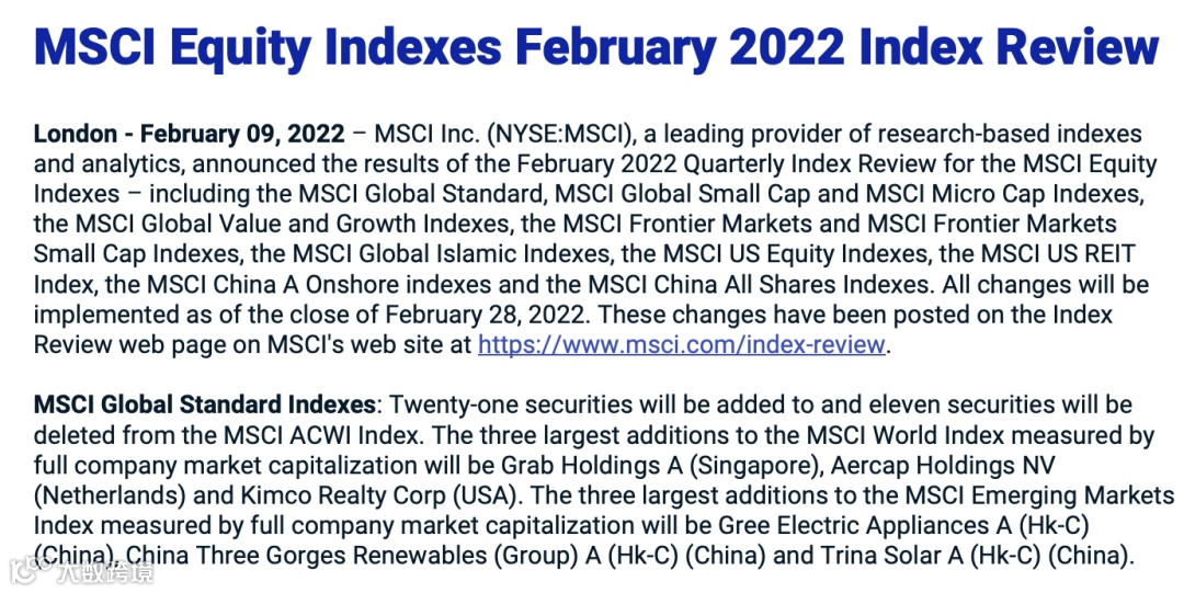 这一调整结果将于2022年2月28日收盘后生效。