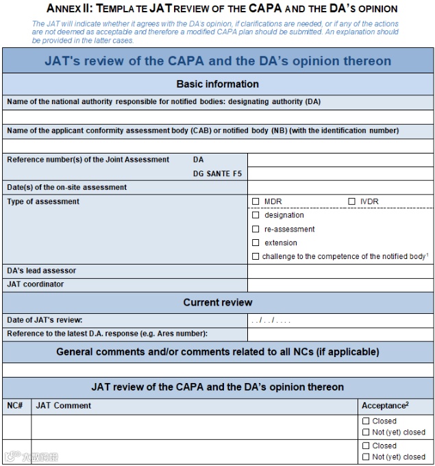文件详细介绍了CAPA计划的制定流程,包括不符合项的纠正措施、根本原因分析、预防措施以及有效性验证。此外,值得提出的是本指南附件I(以下简称CAPA模板)和附件II(以下简称JAT审查模板)的使用并非强制性的。然而,按照本指南使用这些模板来构建CAPA计划并进行审查,将有助于NBs、DAs和JATs高效、一致且及时地进行CAPA审查流程。