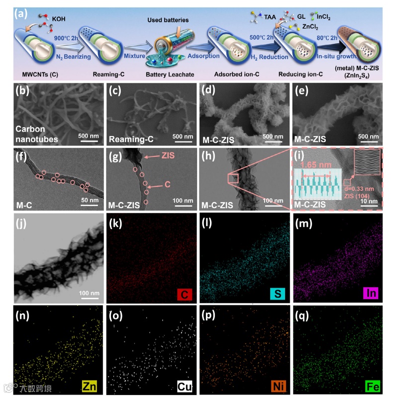 图3 a) M-C-ZIS合成示意图;b) C、c) Rearming-C(通过KOH孔扩张处理得到的活化MWCNTs)以及d,e) M-C-ZIS的SEM图像;f) 金属离子吸附后C的TEM图像;g,h) M-C-ZIS的TEM图像;i) M-C-ZIS的HRTEM图像;j–q) HAADF-STEM图像及C、S、In、Zn、Cu、Ni和Fe的EDX元素映射图像。