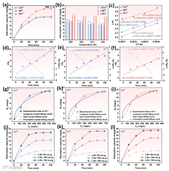 图1 a) 在N2中900°C煅烧的Reaming-MWCNTs对电池浸出液中Cu2+、Ni2+和Fe3+的吸附容量,mg/g表示每克吸附剂吸附的离子质量。b) 900°C-MWCNTs在不同温度下对Cu2+、Ni2+和Fe3+的吸附容量。c) Cu2+、Ni2+和Fe3+在900°C-MWCNTs上的等温吸附模型,K表示反应速率常数。d-f) 900°C-MWCNTs的吸附动力学模型。g-i) 不同液固比(L/S)下Cu2+、Ni2+和Fe3+的吸附情况,L表示电池浸出液的体积,S表示吸附剂的质量。j-l) 不同液固比下的吸附容量。
