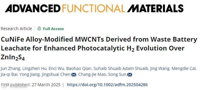 本研究通过将具有优化孔径分布的活化MWCNTs用于高效吸附金属离子,并作为导电介质促进CuNiFe合金助催化剂与ZIS之间的电荷转移,成功解决了光催化制氢中面临的挑战。CuNiFe合金助催化剂与高导电性的活化MWCNTs的协同作用,不仅显著提升了ZIS的产氢活性和稳定性,还为金属回收与光催化制氢的结合提供了新思路。这一策略为推进金属硫化物在光催化中的实际应用提供了可扩展且成本效益高的方法,有望在可持续能源和资源回收领域发挥重要作用。