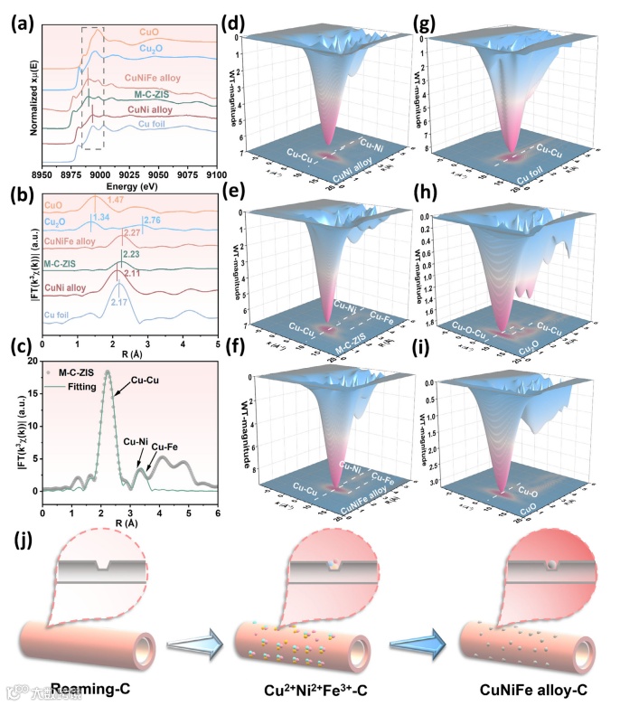 图2 a) Cu K边XANES谱。b) R空间的傅里叶变换曲线。c) M-C-ZIS在R空间的EXAFS拟合曲线。d-i) CuNi合金、M-C-ZIS、CuNiFe合金、Cu箔、Cu2O和CuO的Cu K边WT-EXAFS。j) 在吸附实验后,CuNiFe合金在多壁碳纳米管孔道中形成的示意图。
