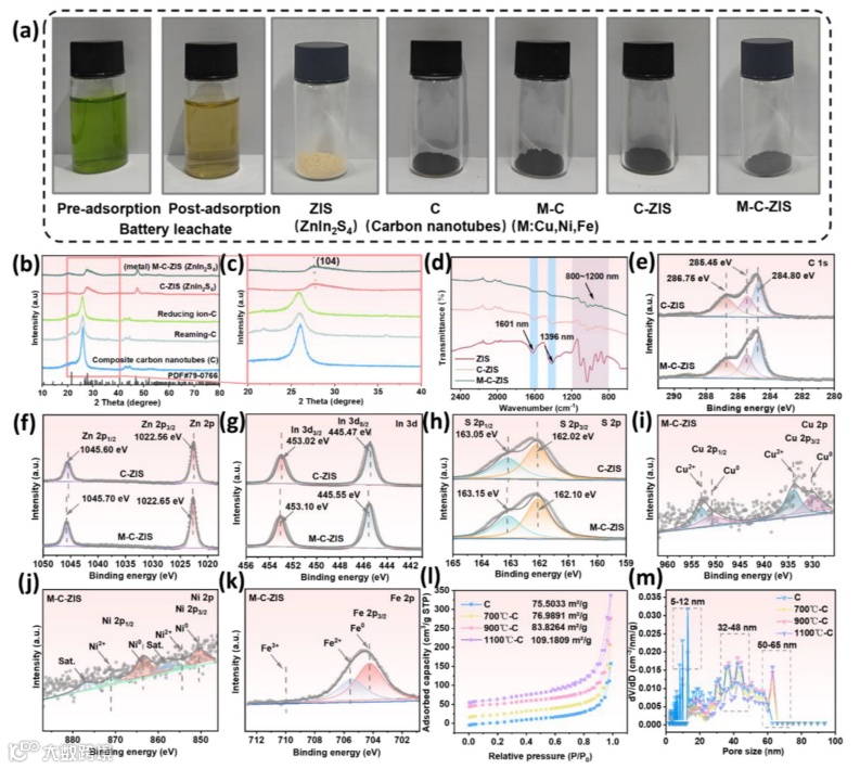 图4 a) 电池浸出液吸附前后的状态及各样品的基本情况。b,c) C、Reaming-C、Reducing-C、C-ZIS和M-C-ZIS的XRD图谱及放大视图。d) ZIS、C-ZIS和M-C-ZIS的FT-IR谱图。e) C、f) Zn、g) In和h) S在C-ZIS和M-C-ZIS中的XPS谱图。i) Cu、j) Ni和k) Fe在M-C-ZIS中的XPS谱图。l) 不同煅烧温度下Reaming-C的N2吸附-脱附等温线和m) 孔径分布。