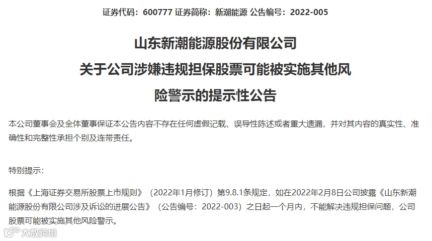 2月8日晚,新潮能源公告,公司涉嫌违规担保,涉及公司可能承担的债务本金约为15.94亿元,约为公司最近一期经审计净资产的12.82%。公司指出,如在2022年2月8日公司披露《山东新潮能源股份有限公司涉及诉讼的进展公告》之日起一个月内,不能解决违规担保问题,公司股票可能被实施其他风险警示。