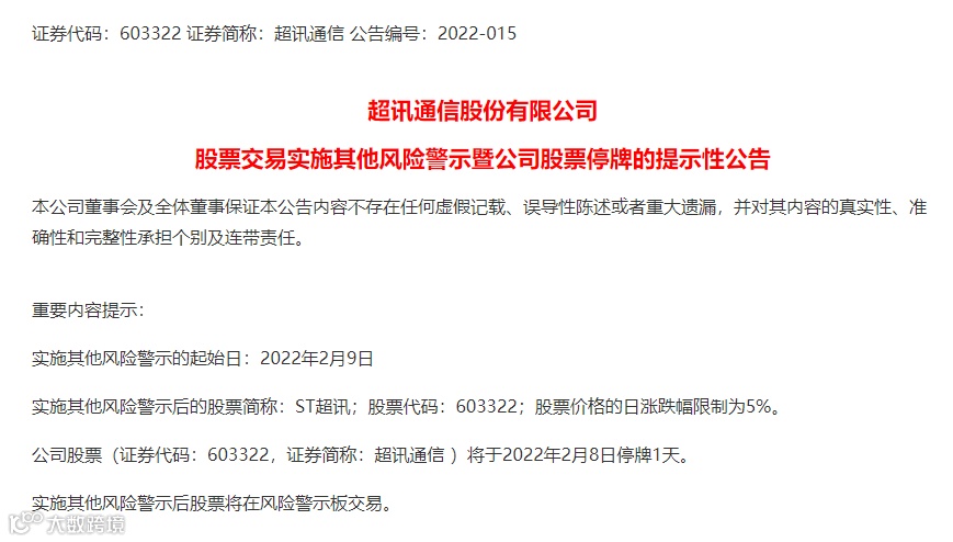 2月8日,超讯通信发布公告称,自2022年2月9日起,公司股票被实施其他风险警示,股票简称由“超讯通信”变更为“ST超讯”,股票价格的日涨跌幅限制为5%。公司股票2022年2月8日停牌1天。