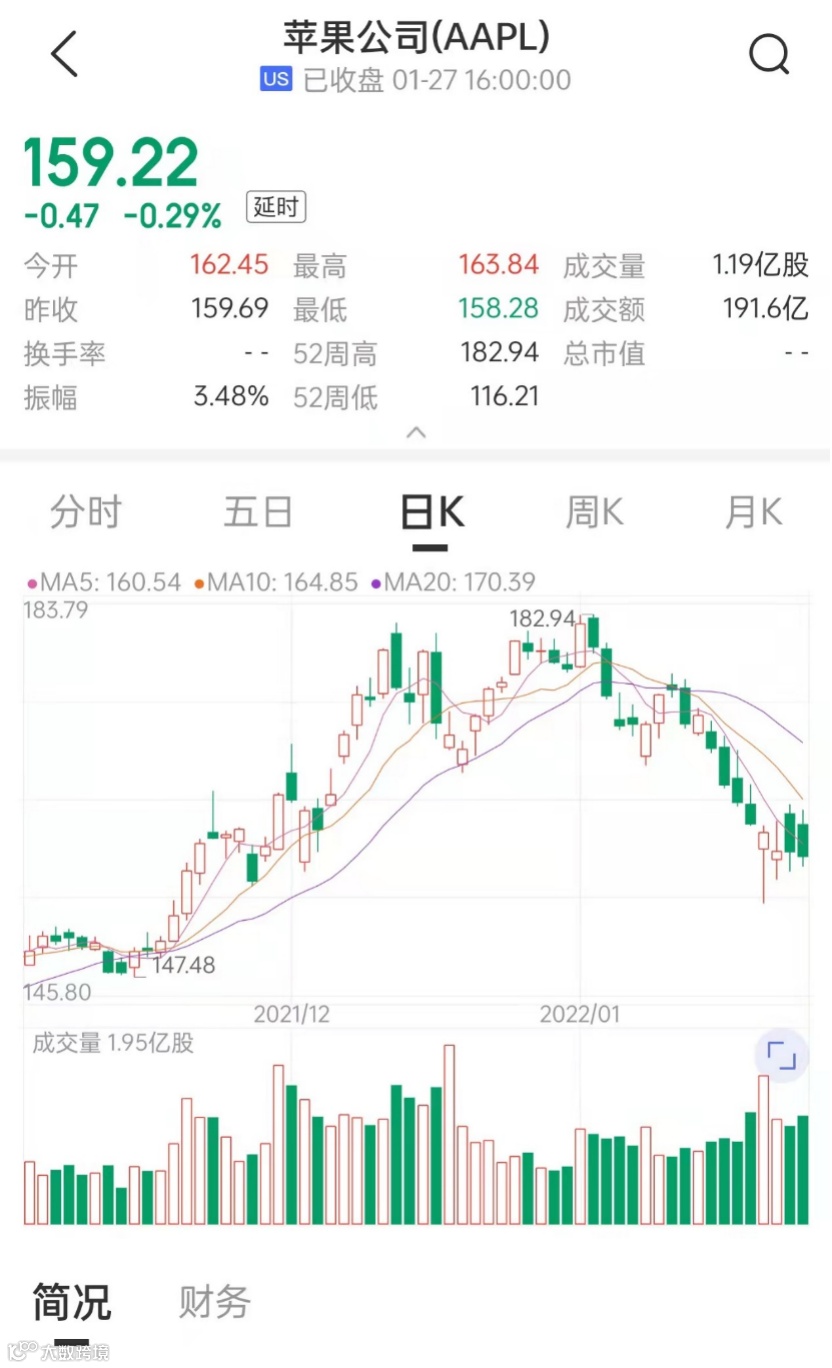 2022年1月初,苹果股价大涨,市值一度超过3万亿美元,但近期苹果股价震荡下行,东方财富Choice数据显示,苹果市值从当地时间1月3日收盘的29730.19亿美元缩水至1月27日的26007.59亿美元,不到一个月蒸发3722.6亿美元(约合人民币23691亿元)。