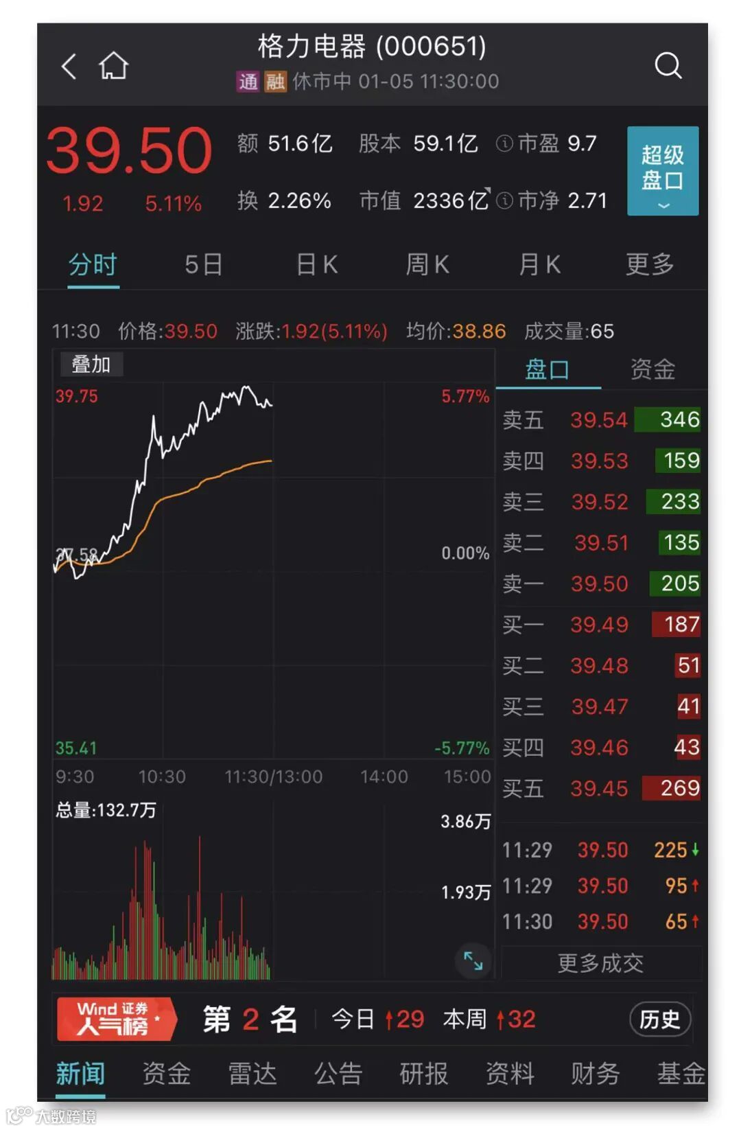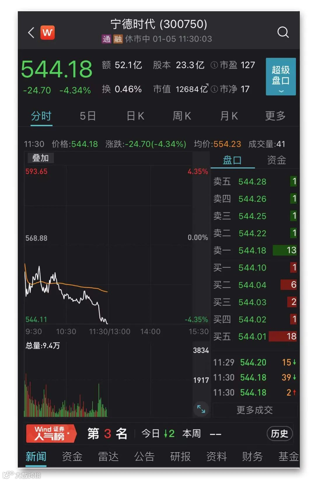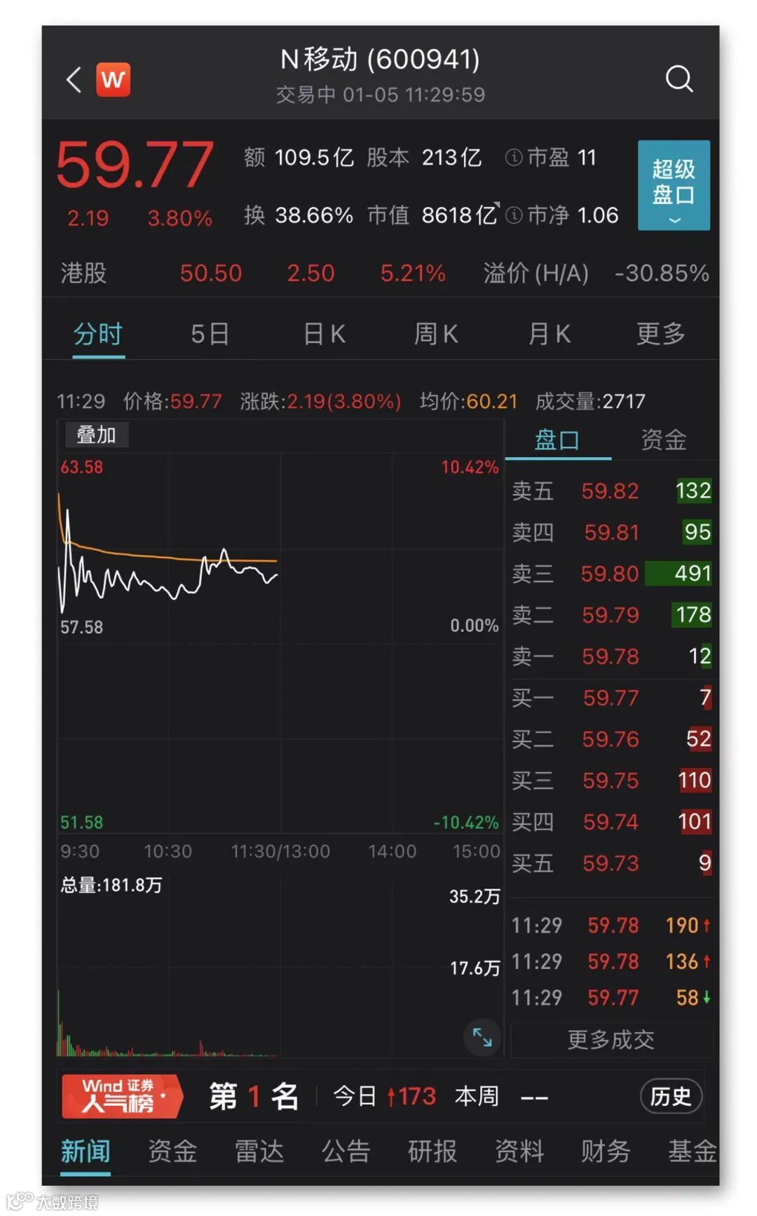 1月5日上午,A股最吸人眼球的当属中国移动上市,上午收盘中国移动上涨3.8%,报59.77元,成交金额为109.5亿元,位居上午A股成交额排行首位。