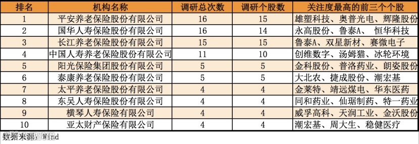 从险资整体调研情况来看,Wind数据显示,截至14日,1月份平安养老参与调研16次,共调研15家上市公司,位居险资调研次数和个股数的榜首。国华人寿、长江养老、国寿养老调研次数也均达到10次以上,位于前四位。