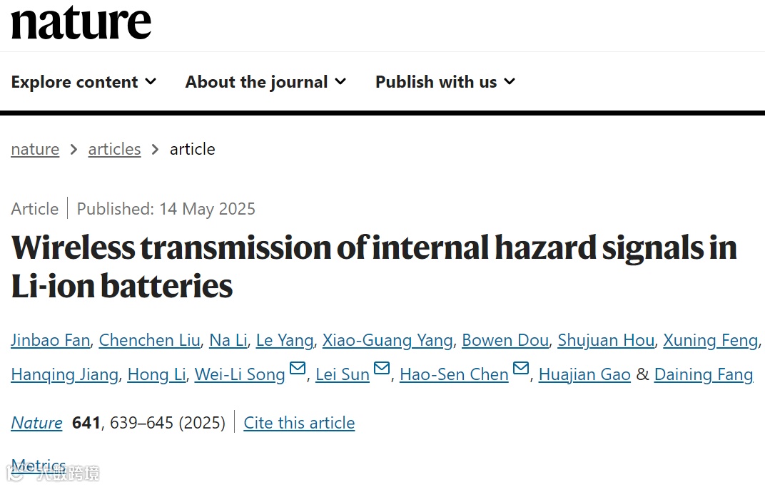 在此,来自北京理工大学的宋维力、孙磊以及陈浩森等研究者提出了一个小型化和低功耗的系统,能够准确地感知和无线传输LIBs内部的温度和应变信号,而对其性能的影响可以忽略不计。相关论文以题为“Wireless transmission of internal hazard signals in Li-ion batteries”于2025年05月14日发表在Nature上。