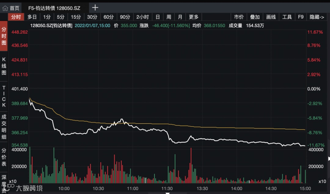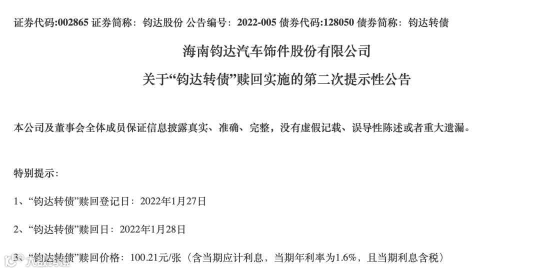 除滨化转债外,本月还有一只可转债将提前赎回。钧达股份发布的提示性公告显示,钧达转债赎回登记日为2022年1月27日,赎回价格为100.21元/张,2022年1月28日该转债将停止交易和转股。1月7日,钧达转债收报355元/张。这意味着,若债券持有人未及时转股或卖出,直接损失将高达72%。