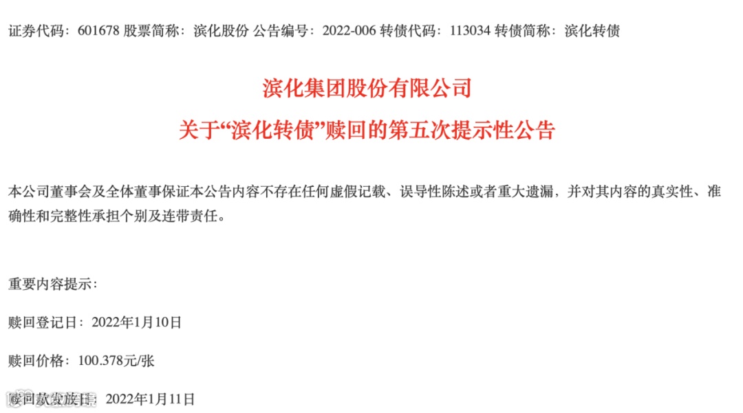 公告显示,滨化转债赎回登记日为2022年1月10日,赎回价格为100.378元/张。