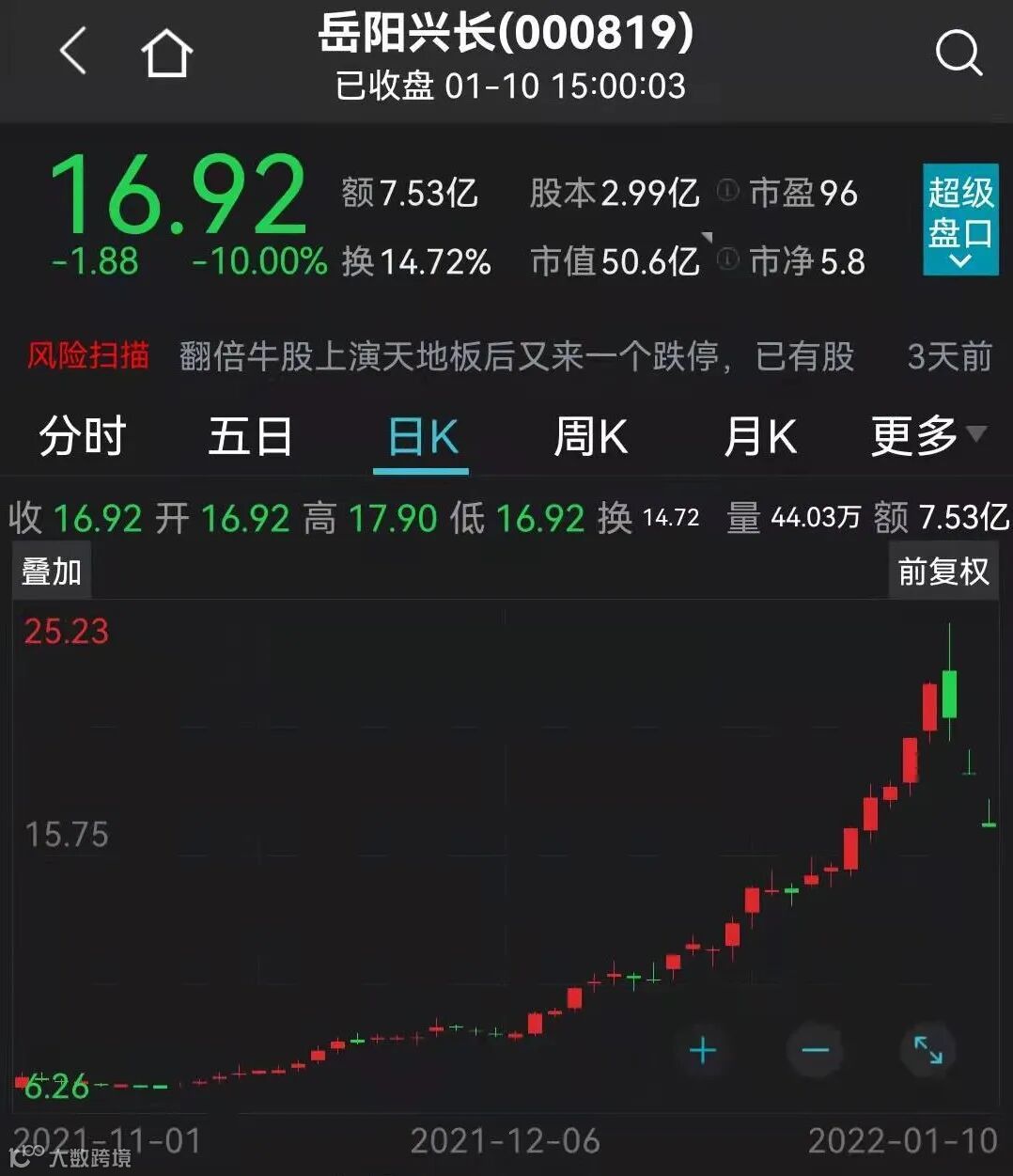 今日闪崩跌停的还有近期热门股岳阳兴长。Wind数据显示,在1月6日盘中创出阶段新高后,岳阳兴长最终下跌6.32%。此后的两个交易日,公司股价连续跌停。从2021年11月中旬至2022年1月5日收盘,岳阳兴长股价在不到2个月的时间从7元出头暴涨至22.30元。
