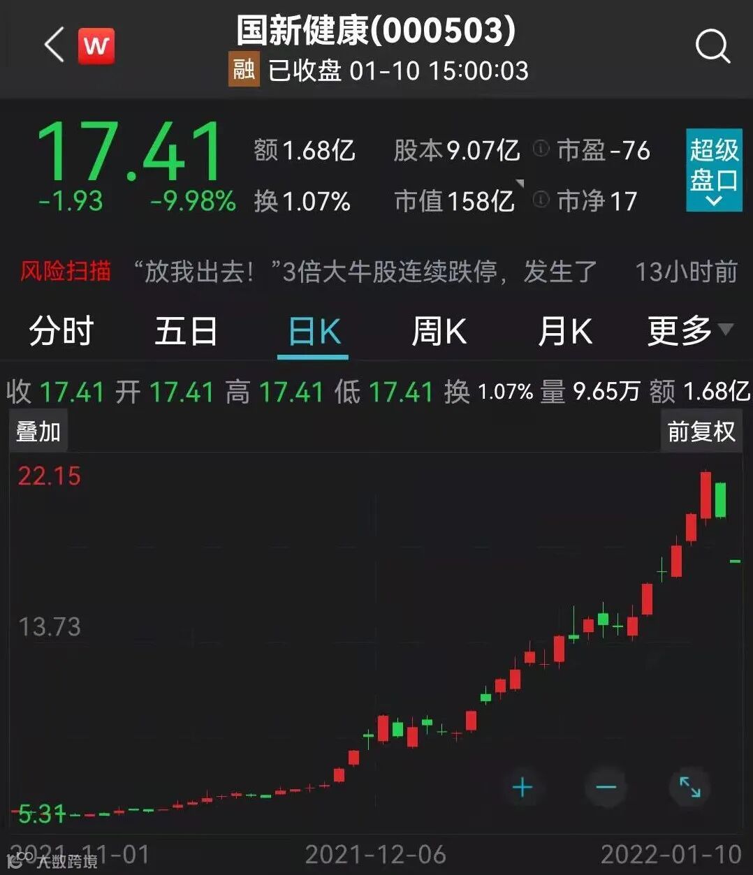 这是国新健康的第二个跌停板,上周五公司股价也突然跌停。从2021年11月4日盘中创出阶段新低,到2022年1月6日股价创下近3年来新高,国新健康股价2个多月大涨逾255%。