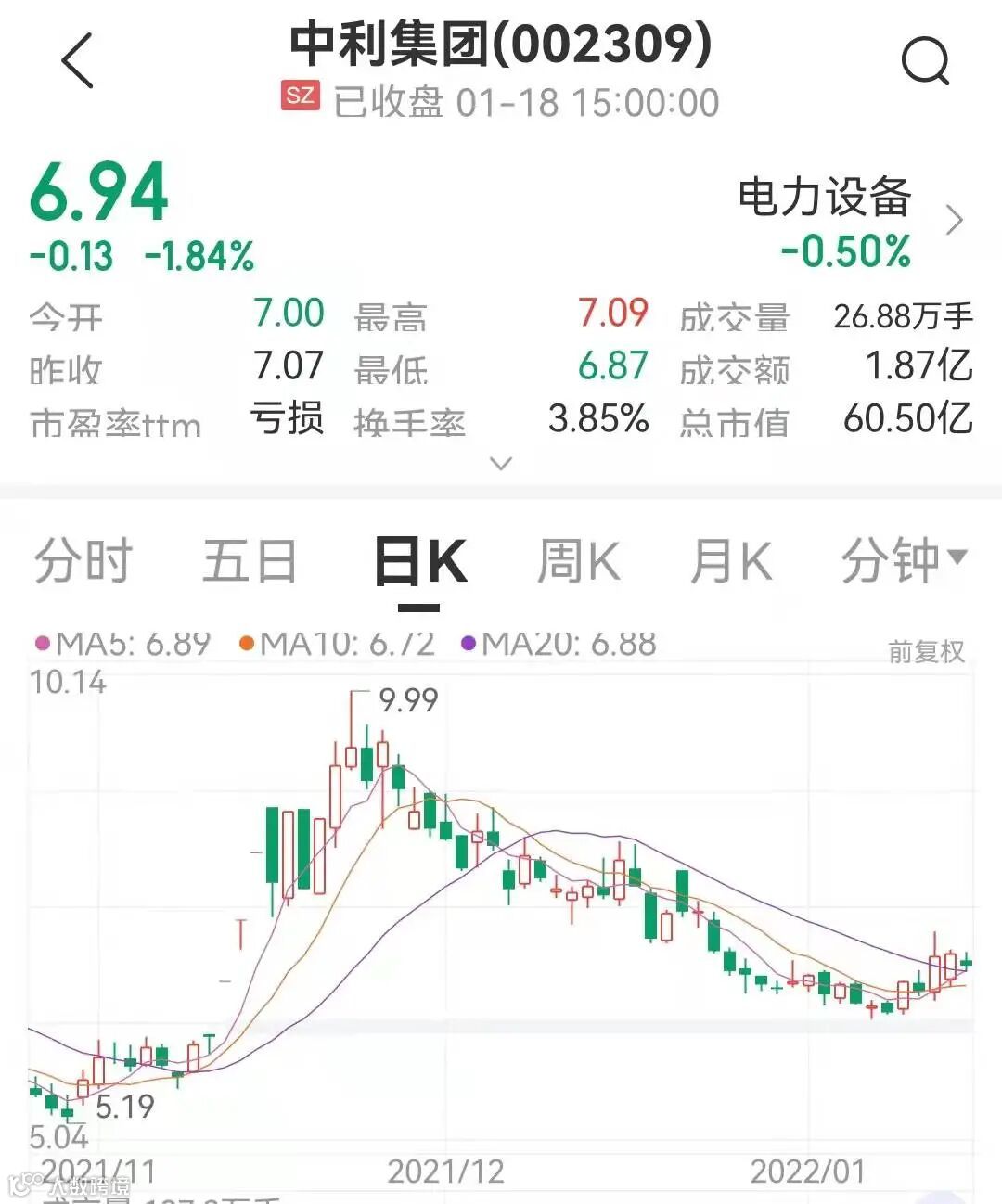 截至1月18日收盘,中利集团收报6.94元/股,收盘跌幅达到1.84%,收盘市值逾60亿元。