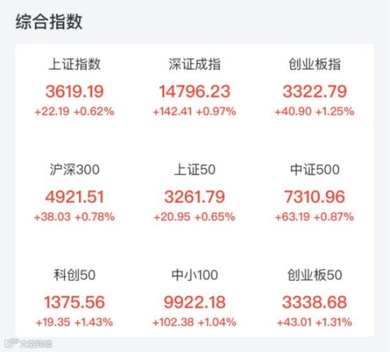 截至收盘,上证指数上涨0.62%,重返3600点,深证成指上涨0.97%,创业板指上涨1.25%。两市成交额达1.01万亿元,较昨日有所放量。