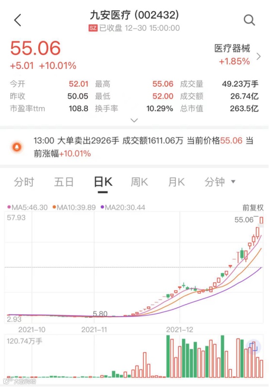 在连板股三羊马跌停的情况下,另一只高位股九安医疗今日再度涨停。近两个月,九安医疗收获23个涨停,累计涨幅达813.1%。